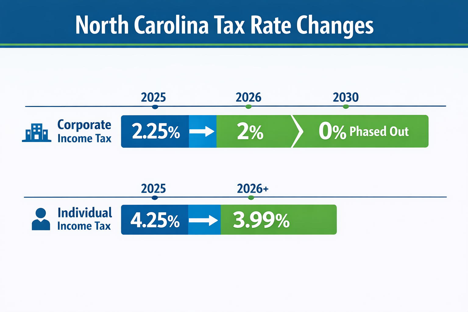 North Carolina’s corporate income tax rate is 2.25% and will be reduced to 2% in 2026. The tax is planned to be phased out completely starting in 2030. The North Carolina individual income tax rate is 4.25% and is scheduled to decrease to 3.99% for taxable years after 2025.